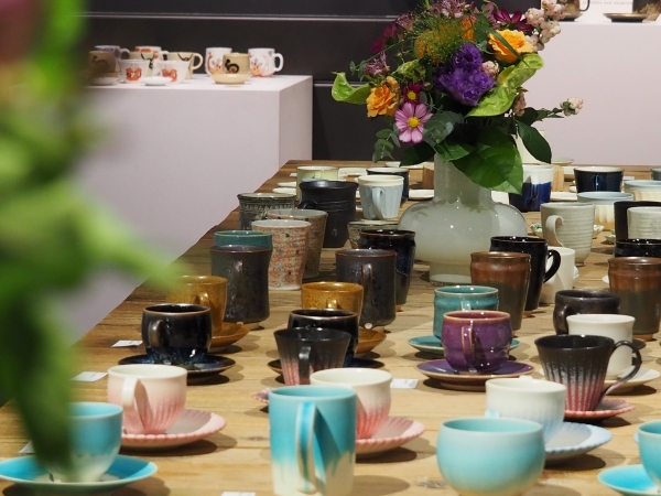 京都で制作する職人・作家たちによる、コーヒーカップやマグカップ、カトラリースタンドにお菓子皿といったコーヒータイムを彩るうつわの数々が、京都伝統産業ミュージアムに集まる