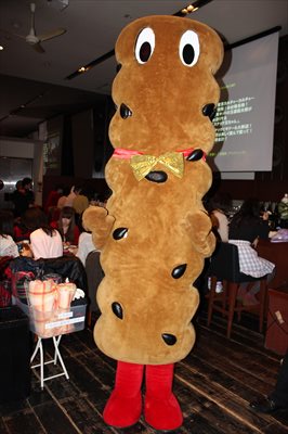 ギンビスのマスコット、アスパラくんは同社の製品「アスパラガスビスケット」のゆるキャラ。なんと身長は2m以上。威圧感ハンパない。一緒に写真を撮ると、かなりの確率で写真に入りきらない。一般のお客様の前に出るのは、1年に3日くらいという、マスコットとは思えないレアさ。普段は展示会などで業界の人たちの前には出ているらしい。広い会場でも目立つのが取り柄とのこと。
