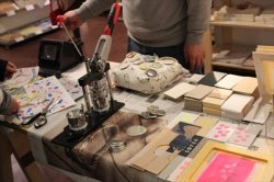 今回のイベントでは、レトロ印刷JAMさん協力のもと、孔版印刷という方法を使ってブックカバーが印刷されている。この印刷は、自動孔版印刷機(リソグラフ)を使用したもの。JAMの小林さんにお話を伺ったところ、「プリントゴッコ」のような機械で、穴からインクが出て、紙に定着することで印刷が出来るのだという。インクが手に付いたり、顔料が残ってしまったりもするが、そこが面白いと語ってくれた。
