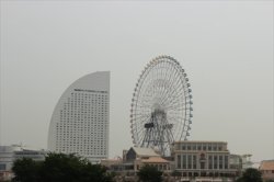みなとみらいの観覧車や高層ビルが、熱と湿気で霞む。