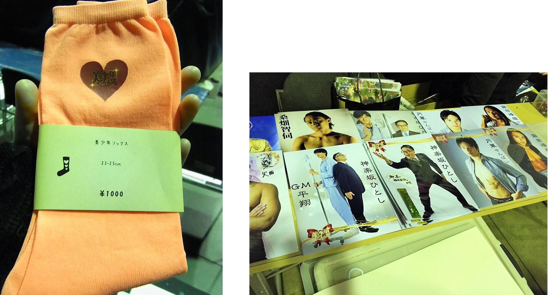 左)「美少年くつ下」(1,000円) 右)ポートレート写真(各1,000円)