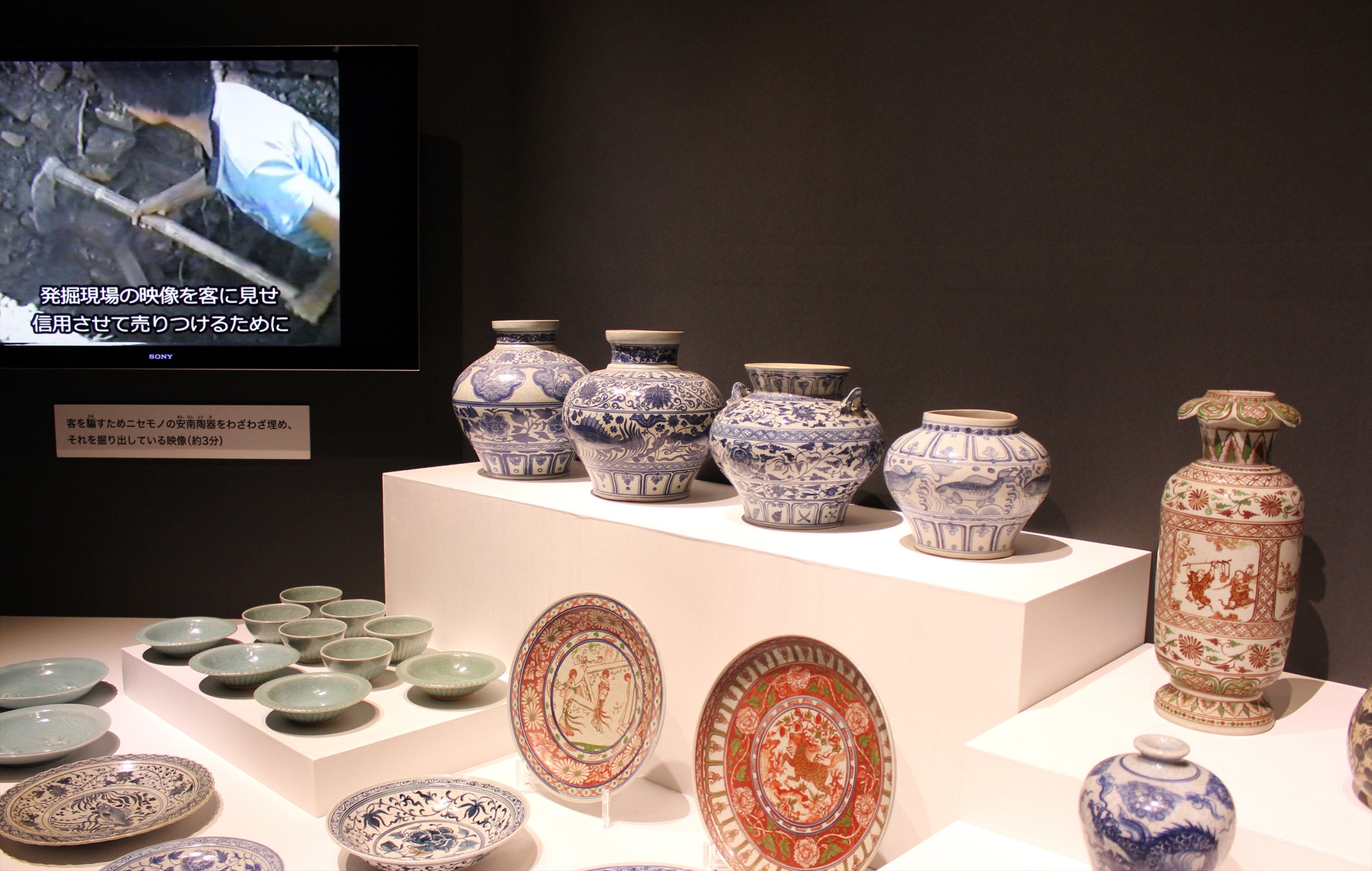 わざわざニセモノを土に埋め、嘘の発掘ビデオまで制作し、偽安南陶器を客に売りつけた。 ちなみにこの展覧会は照明にもかなり気を配っているらしく、展示品が美しく照らし出されている。その照明のおかげか、素人目にはなんだか高そうな陶器に見えてしまう。ホンモノを知らないと、ニセモノと判断することも出来ないのだ。