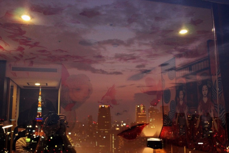 東京の空を金魚が泳いでいるようにも見える。こうした窓への映り込みも計算して、各アーティストは作品を描いていると言う。
