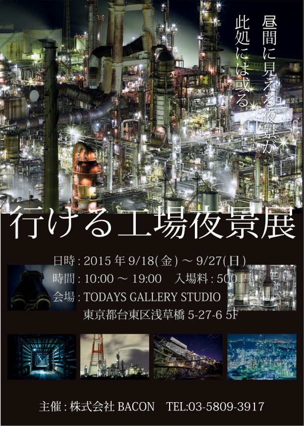 7月に「変わる廃墟展」をやることを決めたのと同時に、候補に上がっていたのが工場夜景展でした。工場夜景は”工場萌え”という言葉がすでにあるように、2年程前にメディアにも取り上げられ、当時は工場夜景クルーズツアーなど大手旅行代理店でも取り扱いがあったほどの人気になりました。