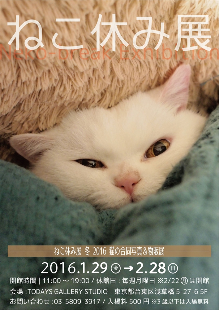 浅草橋・TODAYS GALLERY STUDIOで、 “見るだけでほっこり”できる、都内最大規模のネコの合同写真&物販展「ねこ休み展 冬 2016」が2月28日まで開催中。