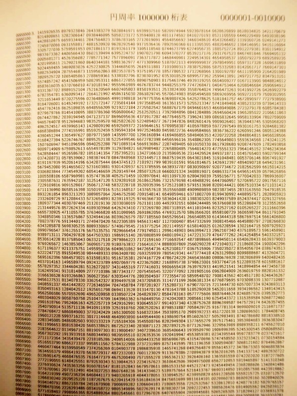 2012年のとある日。神田の某大型書店・同人誌コーナーにて、奇妙な本を発見した。表紙に大きく「π」の文字、そして「円周率1,000,000桁表」と書いてある。