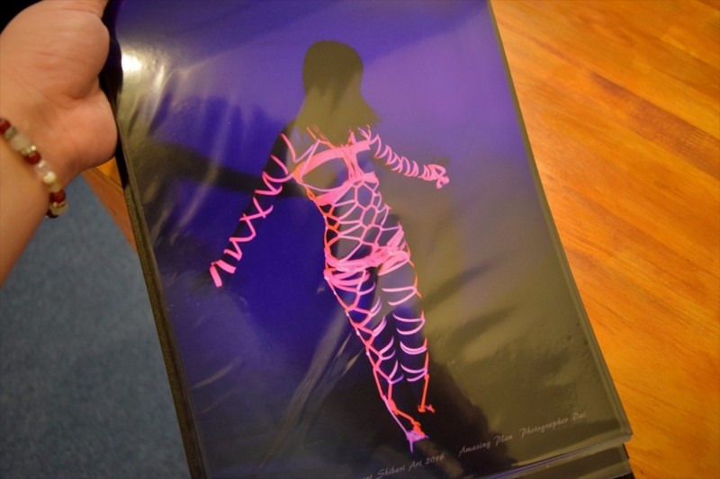 蛍光ロープを使った緊縛写真の数々も展示されている。女性の裸体に結びつけられた、ピンク、イエロー、オレンジのカラフルな線たちはどれも芸術的であり、思わずうっとりと見つめてしまう。