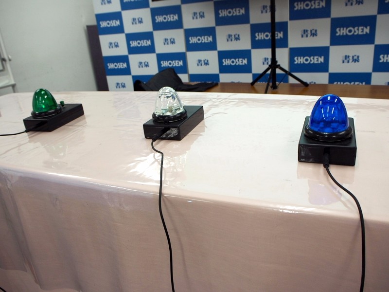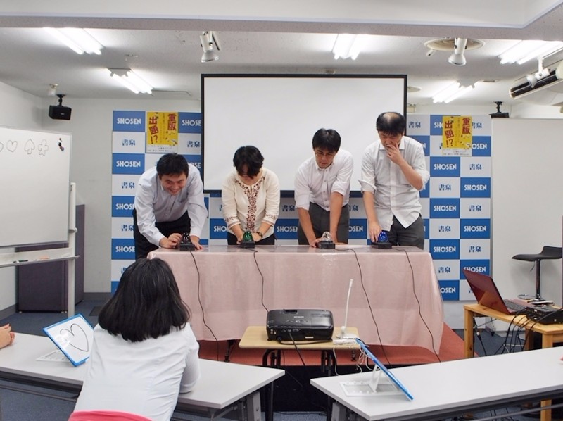 会場は7Fのイベントスペース。15名の参加者が4つに分かれ、チーム戦でバトル。テーブルには、テレビ番組などでおなじみの「早押し機」も並べられています。