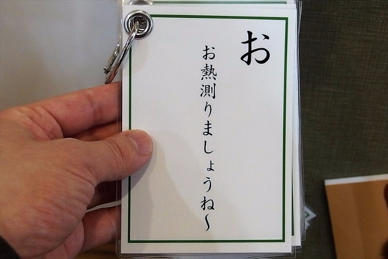 かるたなので読み札が用意されており、照らし合わせて楽しむことができる。例えば読み札「お」なら「お熱測りましょうね~」。