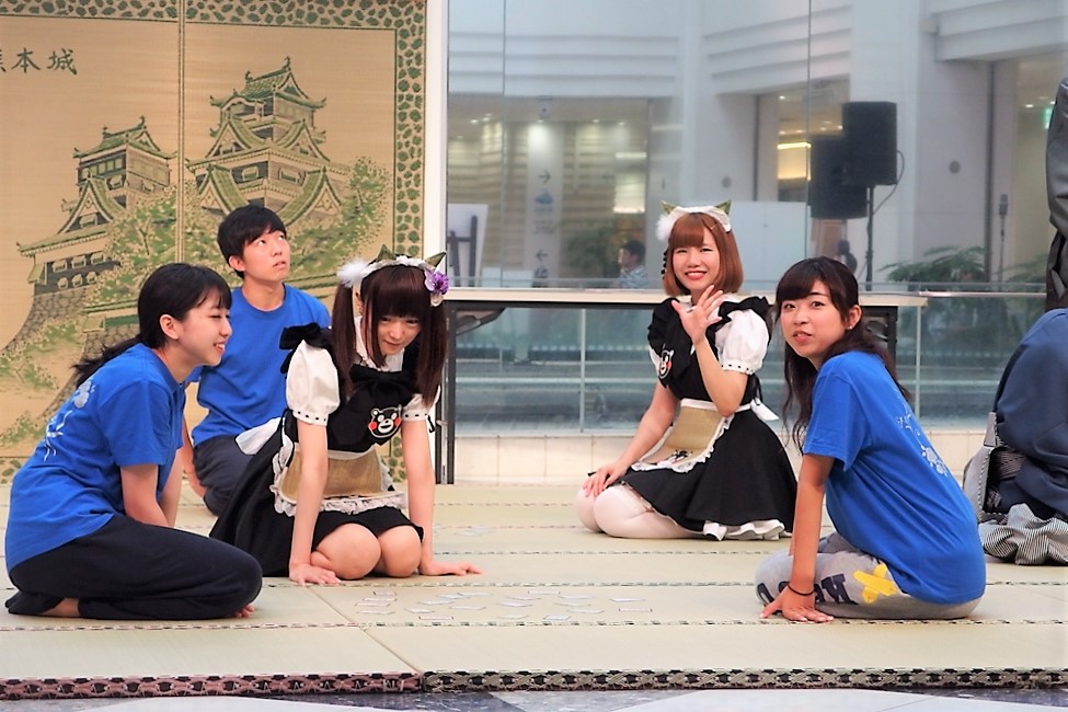 ステージでは一般の方や畳メイドも加わって、競技かるたを畳の上で体験していた。特に和服の2人は、「真剣」モード。これでも手を抜いているのかもしれないが、いわゆる競技かるたの速さを実演してくれた。