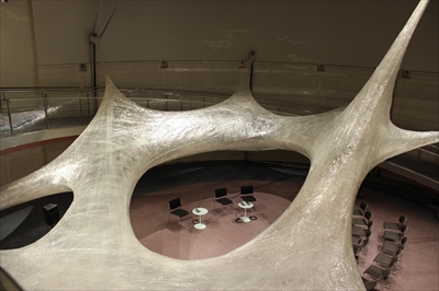 素材にテープを選んだ理由は、強い、安い、たくさん使える、接着する、重ねられる、強度がある、などの理由から(ちなみにテープは 29000メートルも使われているらしい)。テープは一次元的な直線から、二次元的な面になり、三次元的な立体にもなる。谷尻氏が世の中のものすべてが材料になるか?という質問に、いやしい物、あまり価値のない物を敢えて使い、価値のあるものを作りたい、と答えていた。