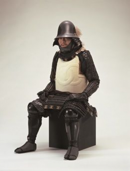 野口哲哉氏(1980~)は、樹脂、プラスチックなどの現代的な素材を使い、敢えて 時を経た風合いの鎧武者を造形している。現在と過去が織りなす、嘘とも現実ともつかない、魅力的な世界観で国内外にファンを持つ。今回が初の個展だ。南蛮渡来の「シャネル」のマークが家紋の甲冑を身にまとった紗錬家しゃねるけの武者、兜のプロペラ型の立物(まるでドラ○もんの‘タケコプター’のよう)で空中を浮遊する武者、当時そんな武者たちがいたのではないか、という巧妙な演出が魅力。