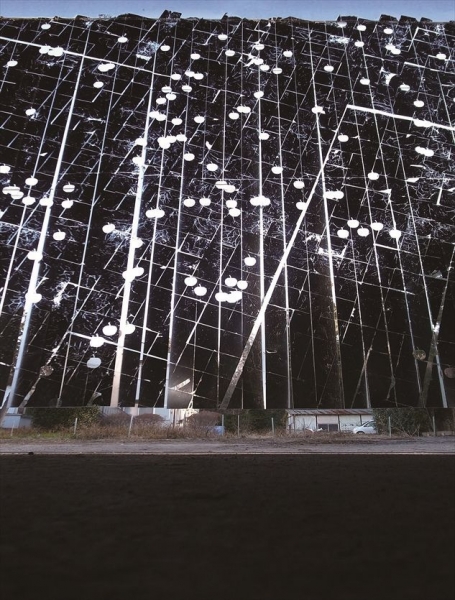 透明のフィルム表面に施されている薄い金属箔に、西欧文明で様々な物語を背景に持つリンゴをシルエットとして、「透過」「反射」に揺らめいた巨大なる樹木・・・すなわち「世界樹」として新たな絵画空間を体感可能です。