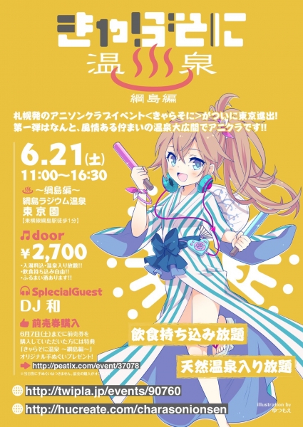 2013年11月から北海道・札幌を中心として、地元DJやゲストを迎えて行われている『きゃらそに』。大人気アニソンクラブイベントが、首都圏初進出!そして、いきなり温泉施設でイベント開催!会場は温泉施設の座敷宴会場。もちろん温泉入り放題、飲食持ち込み自由、振るまい酒も用意される。お座敷でオタ芸を打って汗をかいたら、温泉でさっぱり、そしてお酒でまったりという楽しみ方も出来るだろう。