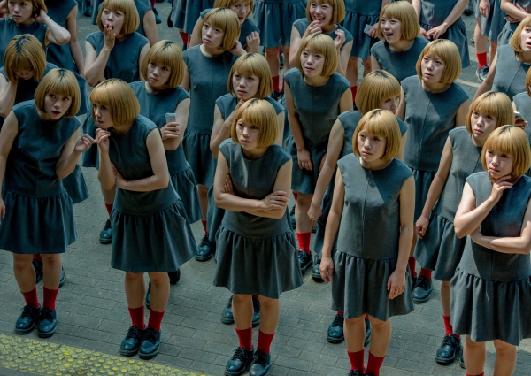 同じ服装の一人の女性が、「笑ったり」「ツンとしたり」「あくびをしたり」・・・。中には隣に話し掛けたてみたり、違う姿勢で無秩序に並んでいるなどミステリアスな写真を代表作に、一人の女性を異なる姿勢で複数登場させ描いた劇画的作品が紹介されます。