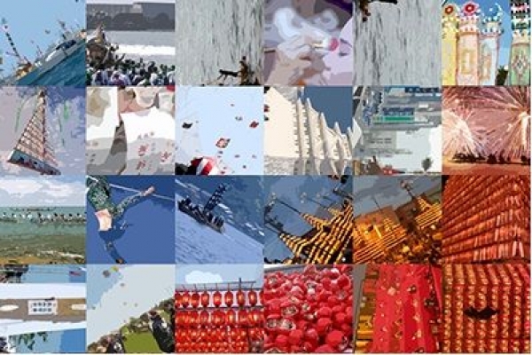 今回のイベントでは、北斎、広重の浮世絵などをモチーフに、日本全国のおよそ570の祭りの風景から切り取られた画像によって構成された作品が並ぶ。一つの作品には約2400枚以上の画像が使用されている。