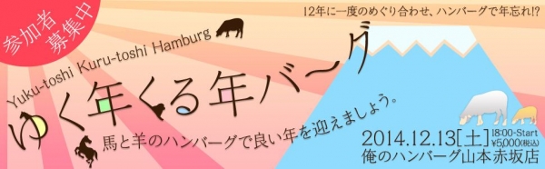2014年12月13日(土)に「俺のハンバーグ山本」赤坂店で、「ゆく年くる年バーグ大忘年会」が開催される。
