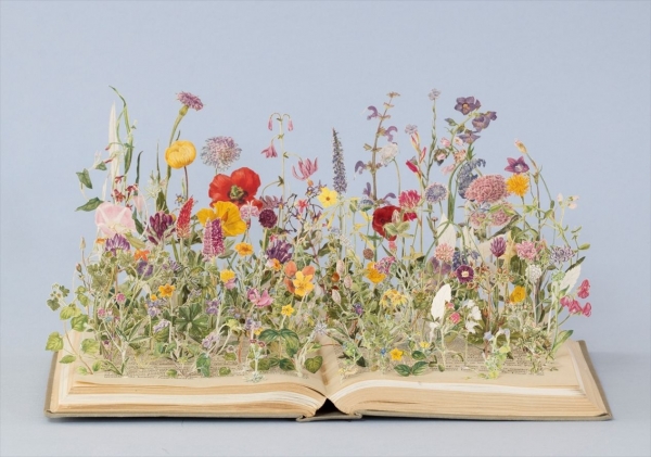 花と植物についての古い本を素材として、ページ上にまるで咲き誇る花を再現したような作品や、ガストン・バシュラールの著書「空間の詩学」に着想を得たブック・スカルプチャー(本を素材とした彫刻)などのインスタレーションを見ることができる。