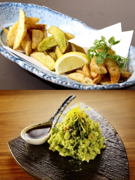 さらにおつまみにもお茶を使用。5種のお茶料理が楽しめるおつまみセットが別途販売される。真緑のビジュアルががインパクト抜群の抹茶ポテトサラダや、3種の味から選べるお茶ポテトフライ、煎茶で煮込んだ豚の角煮の抹茶味噌ソースがけ、抹茶マヨネーズで食べる野菜スティックなど、お茶づくしの盛り合わせとなっている。