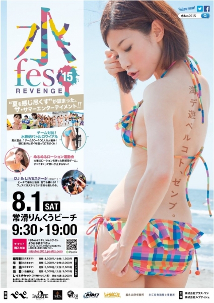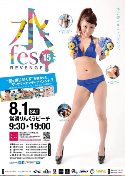 | 料金 | 高校生以上 早割(6月末まで)男性:5,000円 / 女性:2,000円 前売(7月末まで)男性:5,500円 / 女性:2,500円 当日(7月末まで)男性:6,000円 / 女性:3,000円 レイトチケット(15時からの入場)男女共通:3,000円 詳細は⇒http://mizufes2015.peatix.com/ ※危険ですので中学生以下のご参加はご遠慮いただきます。ただし乳幼児の入場は無料で認めます。 |
