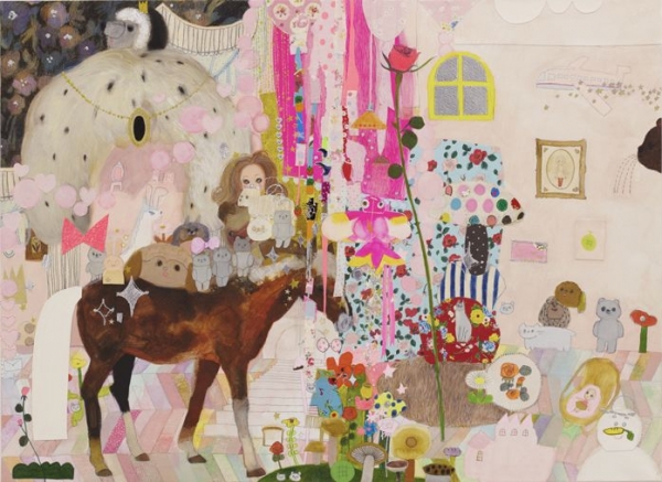 長井朋子さんの作品には、森や部屋を背景として、猫や馬など動物たち、幼い少女、色とりどりの木やキノコが劇場のように配置されている。様々なモチーフが散りばめられた作品には、どれも世界が凝縮したような充足感と、独特の空間性がある。