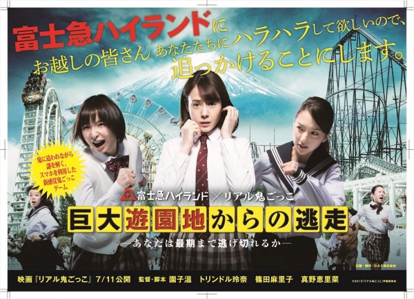 「園子温監督。トリンドル玲奈、篠田麻里子、真野恵里菜がトリプル主演を務める注目の映画『リアル鬼ごっこ』とタイアップした、史上初のスマホアプリ連動鬼ごっこです。