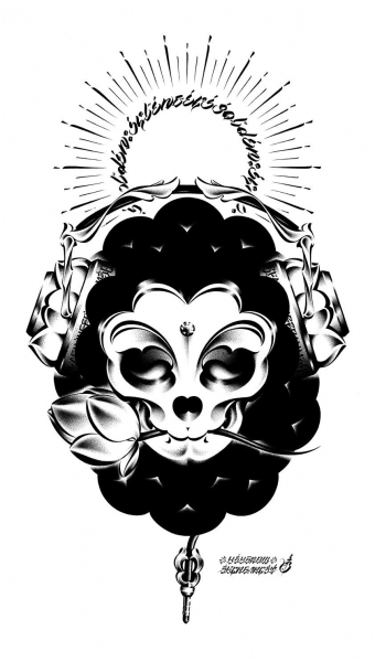死の象徴であり、同時に生を象徴するものでもあります。そんなスカルや様々なモチーフを、白黒の世界で描いています。とても美しいです」
