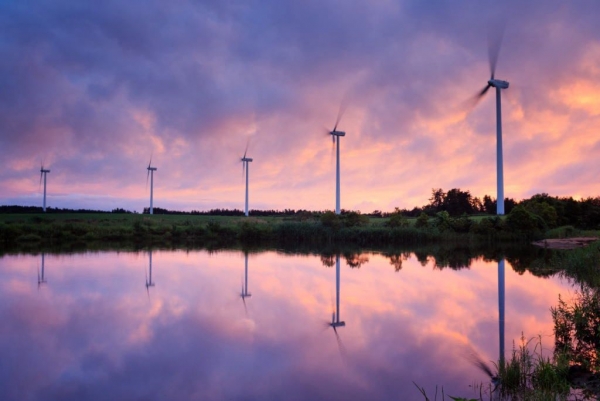 巨大な風車がある光景。風のように自由に、風車は今日もまわる。
