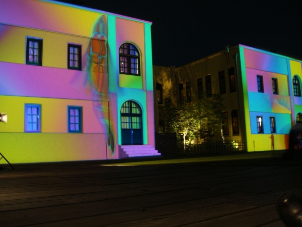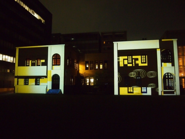 近代建築としてレトロな雰囲気を残す、京都国際マンガミュージアムの建物壁面へのプロジェクションマッピング映像作品の照射を行う。