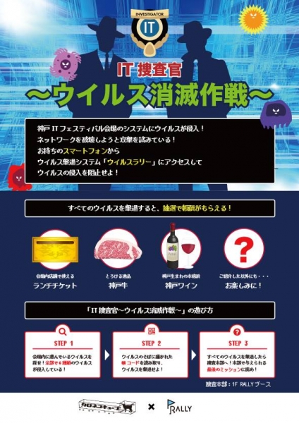 謎解きイベントを制作しているクロネコキューブ株式会社 は、、インターネットサービス開発を手掛ける株式会社フェイスクリエイツとコラボして、神戸 IT フェスティバルにて「IT 捜査官 ~ウイルス消滅作戦~」を開催する。「IT 捜査官 ~ウイルス消滅作戦~」は、会場のシステムネットワークを攻撃しようとするウイルスを、スマートフォンで阻止するというもの。