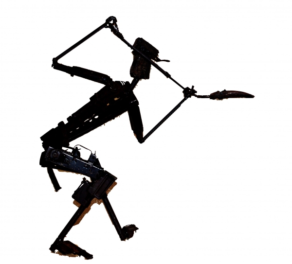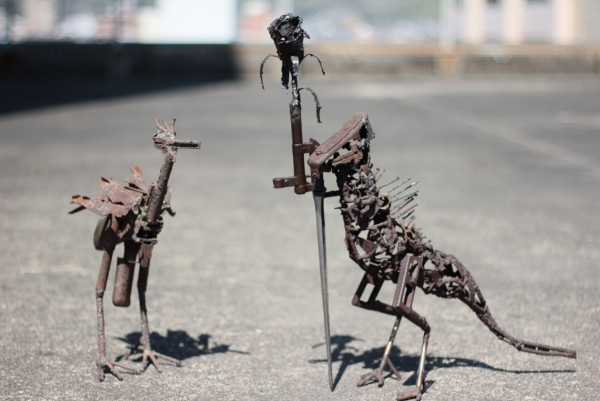 武器は回収されて、鍬や犂、自転車といった生活用具と交換されて建設的な生活のサポートになり、一方、回収された武器は細断され、アーティストの手によってアートに生まれ変わることとなった。今回、あーすぷらざで紹介されるのは、そんな武器アートである。