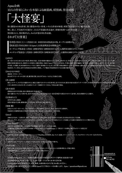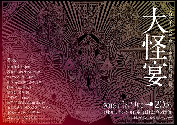 10人の作家とこわい古本屋による 幽霊画、妖怪画、怪奇画展が開催される。「怪」というものに馴染みを持つ作家、怪に馴染みのない作家、様々な作家が幽霊、妖怪、怪奇をテーマに集う作品展。