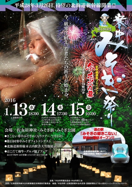 佐女川神社に185年前より伝わる、木古内町を代表する伝統の神事「寒中みそぎ」。五穀豊穣と大漁を祈願し、4人の行修者が13日より2晩徹夜して「水ごり」を行い身体を清め、15日には4体の御神体を抱いて極寒の津軽海峡に飛び込んで洗い清める儀式。