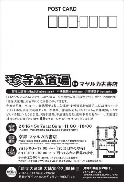 日本やアジアに存在している、ミステリアス&ユニークな神社仏閣を「珍寺」と称して、長年ルポしてきた老舗WEBサイト「珍寺大道場」のイベント。ゴールデンウィークも終盤に差し掛かるころ、珍寺大道場が京都に登場。今回は原宿での展示開催に先立ち、京都でも展示とトークイベントを実施する。