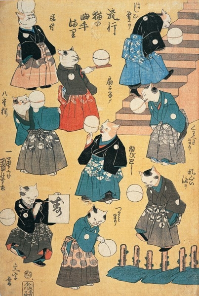猫を主役に登場させたのが、大の猫好きで知られる歌川国芳。彼の狂画(戯画)では、猫たちが人間の姿で大パフォーマンスを繰り広げている。