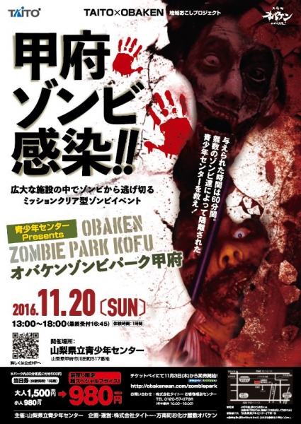 TAITOxオバケン地域おこしプロジェクト 「青少年センターpresents オバケンゾンビパーク甲府」施設全域を封鎖して、自由に遊べるミッションクリア型ゾンビイベントの「オバケン」と「タイトー」がコラボする。