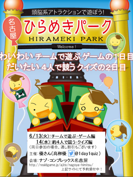 頭をリフレッシュする2日間。ヒラメキ系の運動会が名古屋で開催される。イベントは初めての人でも気軽に楽しめるように、様々に頭を使うアトラクション(コーナー)が展開される。