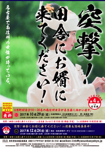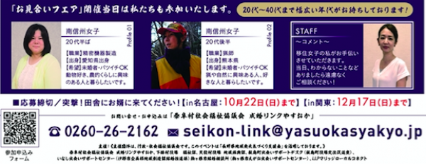 婚活イベント「突撃!田舎にお嫁(お婿)に来ませんか!?」が、10月29日(日)に名古屋で行われる。南信州(長野県南部)5市町村自治体(伊那市、飯島町、下條村、泰阜村、天龍村)と、社会福祉協議会が運営している結婚相談所「成婚リンクやすおか」が実施する。この企画には各自治体関係者も参加しており、田舎暮らしを希望する人たちからの問い合わせにも応じる。