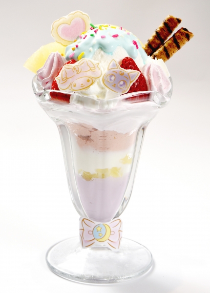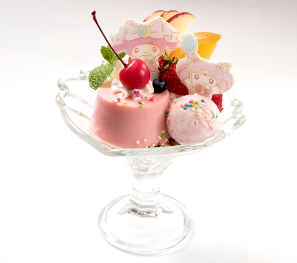 セーラーちびムーンをイメージしたピンクのプリン・ア・ラ・モードです。待ちきれないちびムーンがスプーンを持って今にも食べちゃいそう!?