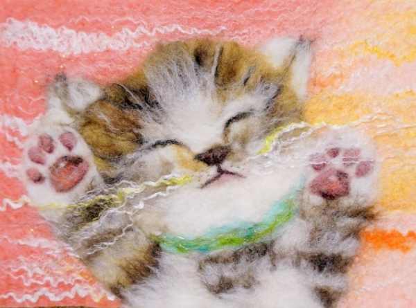 普通の絵画でではなく、柔らかな風合いに仕上がる羊毛や光沢感を表現するシルクで描かれた絵画。絵の具を使用した作品とは異なり、温かみや懐かしさを感じさせてくれる。