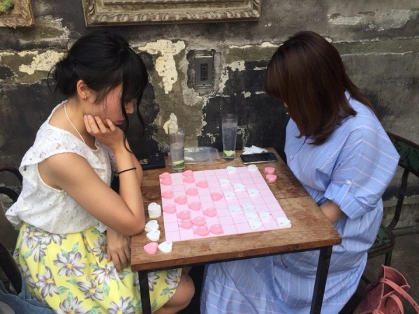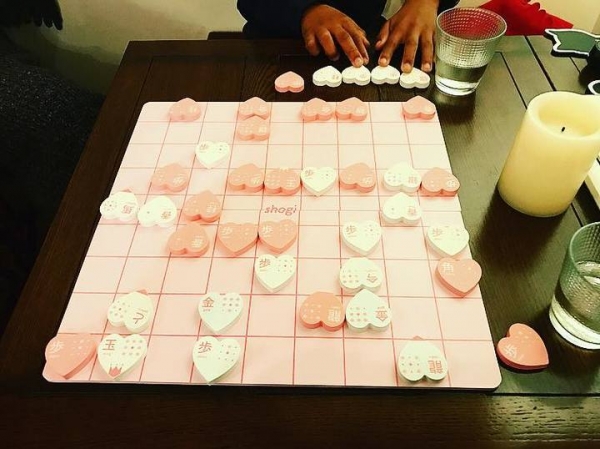 初心者向け将棋セット【ハート将棋】も体験できる。本格将棋盤とは趣の異なる、可愛らしいピンク色の将棋盤。 【ハート将棋】を使って、プロ女流棋士が将棋をレクチャーする機会も。