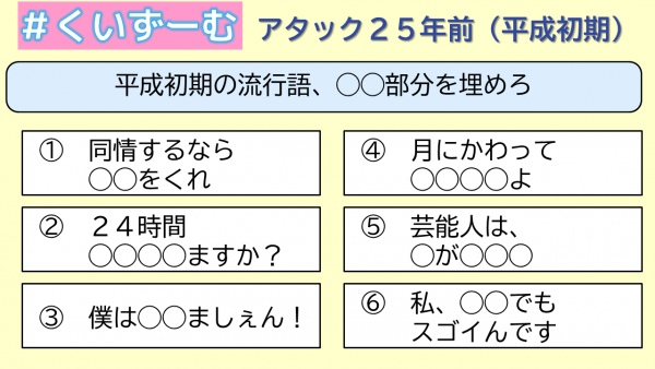 「アタック25年前」と称して、平成元年(1989年)~平成7年(今から25年前の1995年)に関することがテーマ。当時の流行語や人気商品、話題の人物やヒット曲などから出題されるクイズとなっている。