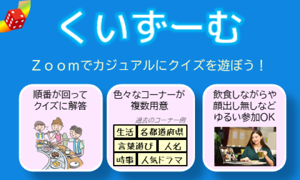9月18日(金)から9月日20(日)まで、【#くいずーむ 9月後半も「Zoomでクイズを遊ぼう」vol.12~14 連休特大号】が行われる。Zoomを使ってリモートで行われるクイズ企画。音声共有と画面閲覧を利用し、顔出しは任意となっている。