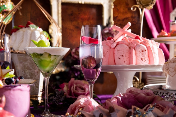 提供されるスイーツは、薔薇のムース・ラズベリークリーム・メレンゲをおしゃれな髪のようにアレンジした「今宵のウィッグ」、王妃のお夜食から着想を得たりんごのキャラメリゼが乗る紅茶のパウンドケーキ「王妃のお気に入り」など、手の込んだものばかり。