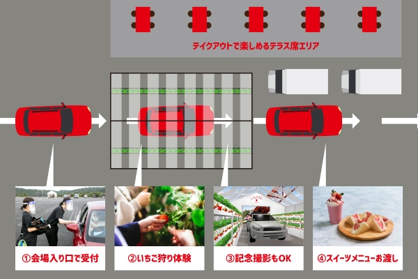 当日会場にはいちごのツタでデコレーションされた特大テントが設置。車に乗車したまま中に入ると、多数のいちごプランターがお待ちかね。車窓からいちごを摘むなど、プライベートないちご狩りを満喫できる。