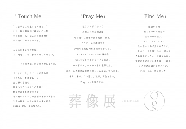 2021年6月4日(金)から6日(日)までの3日間、神奈川県横浜市のギャラリーバー「逃げBar White out」にて、「葬像展」が開催される。同展は、音楽フェスを中心とした体験作品を制作している「体験作家」の雨宮優氏の初個展。テーマは「葬」。自身の全ゲノム配列が記録された「Pray me:再生墓」や、檸檬に触れることで死者の声が再生される「Touch me:双生機」など、計6点が展示される。