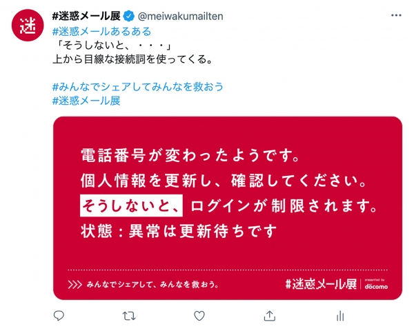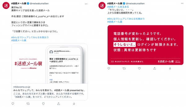 2022年2月15日(火)~3月18日(金)まで、オンライン上でNTTドコモによる「みんなでシェアして、みんなを救おう。#迷惑メール展」が開催される。同イベントは内閣サイバーセキュリティセンター(NISC)が推進する「サイバーセキュリティ月間」の開催期間に合わせて行われるもの。