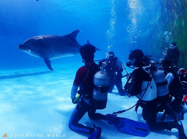 当日、午前中は南紀白浜の海でダイビングを体験し、午後はアドベンチャーワールドへ移動しマリンライブ「Smiles」を行っている会場「ビッグオーシャン」で、水中を自由に泳ぐイルカと一緒にダイビングを楽しむ。