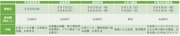 静岡鉄道では、お茶料理のお弁当とお茶コラボアルコールの飲み放題。大井川鐡道では、無料で茶娘による呈茶サービス。天竜浜名湖鉄道では、車内で日本茶インストラクターによる「お茶の淹れ方講座」が開催される。