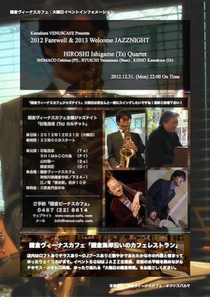 鎌倉ヴィーナスカフェが主催する「2012 Farewell & 2013 Welcome JAZZNIGHT 石亀浩志(Ts)カルテット」